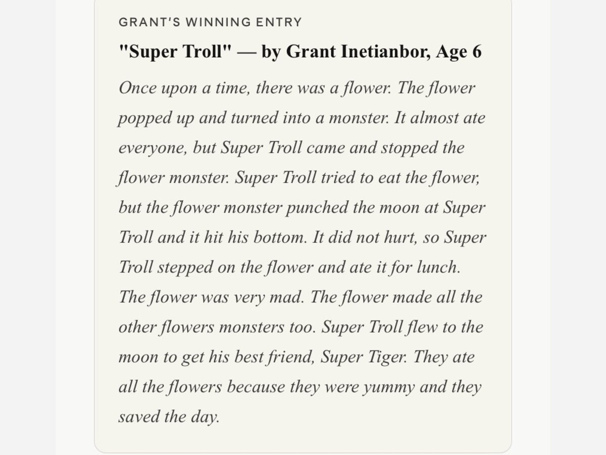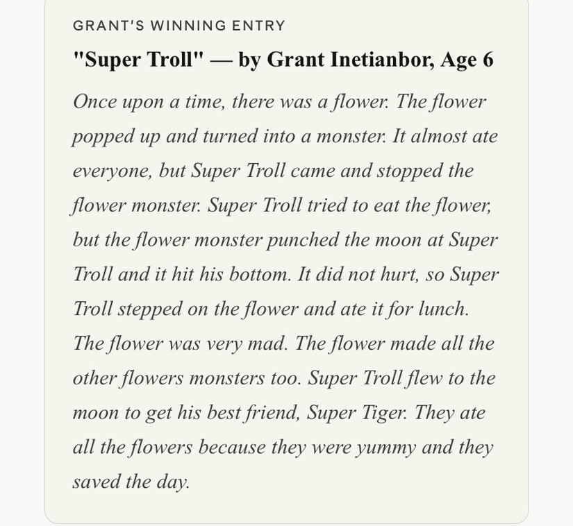 That enthusiasm clearly paid off. Grant's winning story, "Super Troll," is a charming, action-packed adventure that showcases a six-year-old's imagination at full throttle.