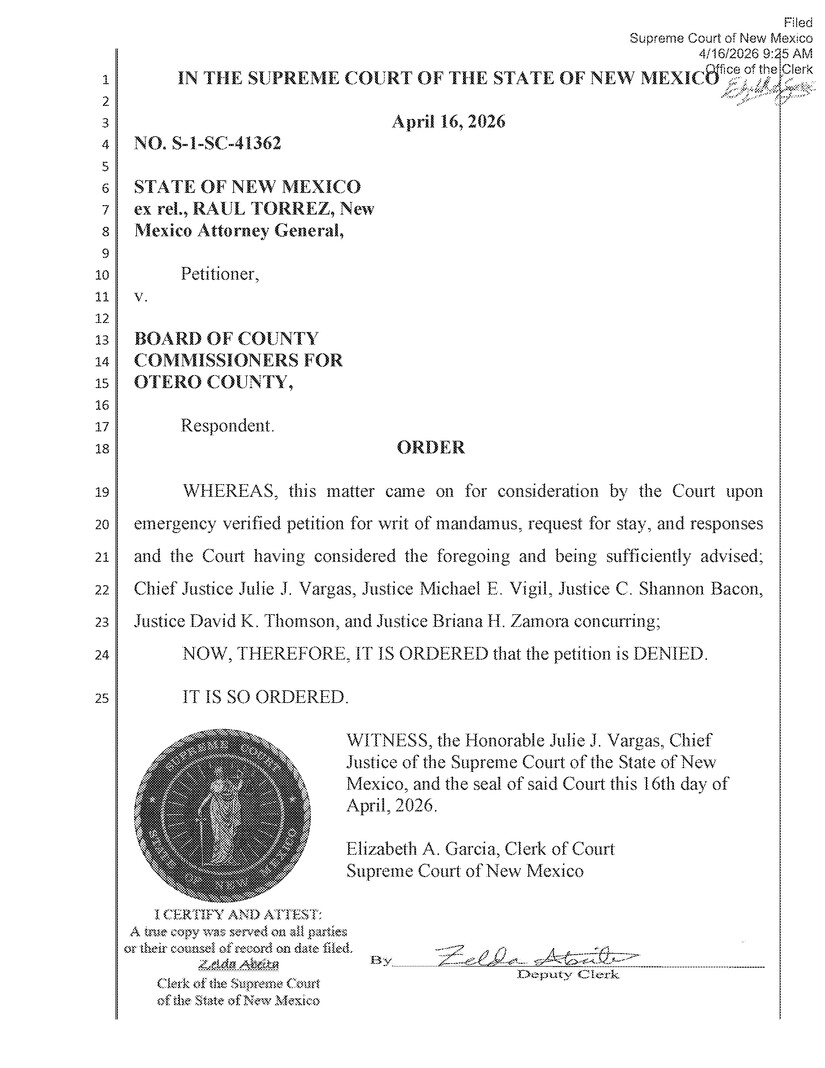In a terse, unanimous order issued this morning, the New Mexico Supreme Court denied Attorney General Raúl Torrez's emergency petition for a writ of mandamus against the Otero County Board of Commissioners — delivering a sweeping legal victory to Otero County and preserving the five-year Intergovernmental Service Agreement between the county and U.S. Immigration and Customs Enforcement for the continued operation of the Otero County Processing Center in Chaparral.