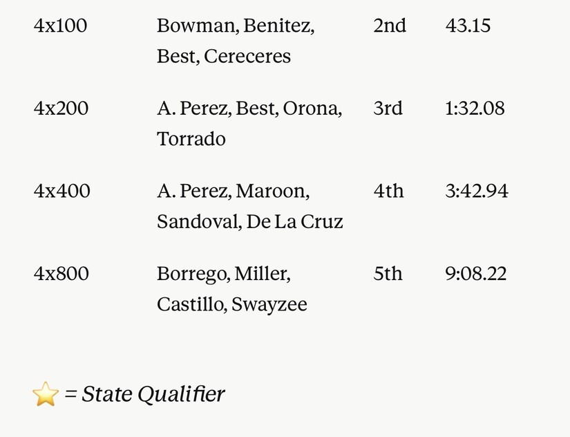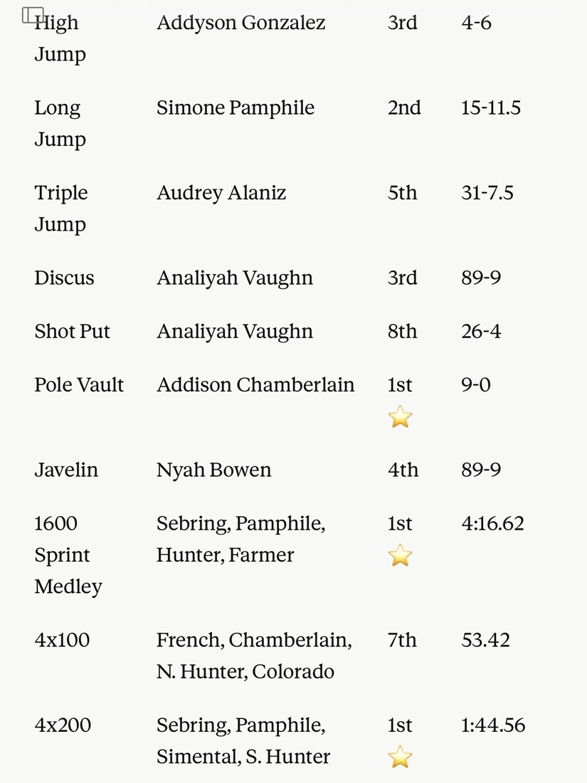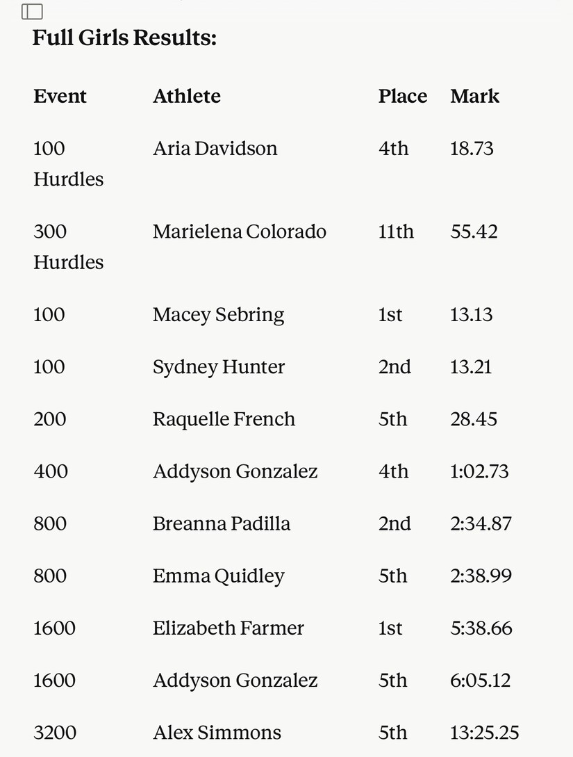 Other notable performances included Breanna Padilla (2nd, 800 — 2:34.87), Simone Pamphile (2nd, Long Jump — 15-11.5), Analiyah Vaughn (3rd, Discus — 89-9), and Addyson Gonzalez (3rd, High Jump — 4-6; 4th, 400 — 1:02.73; 5th, 1600 — 6:05.12).
