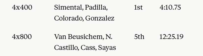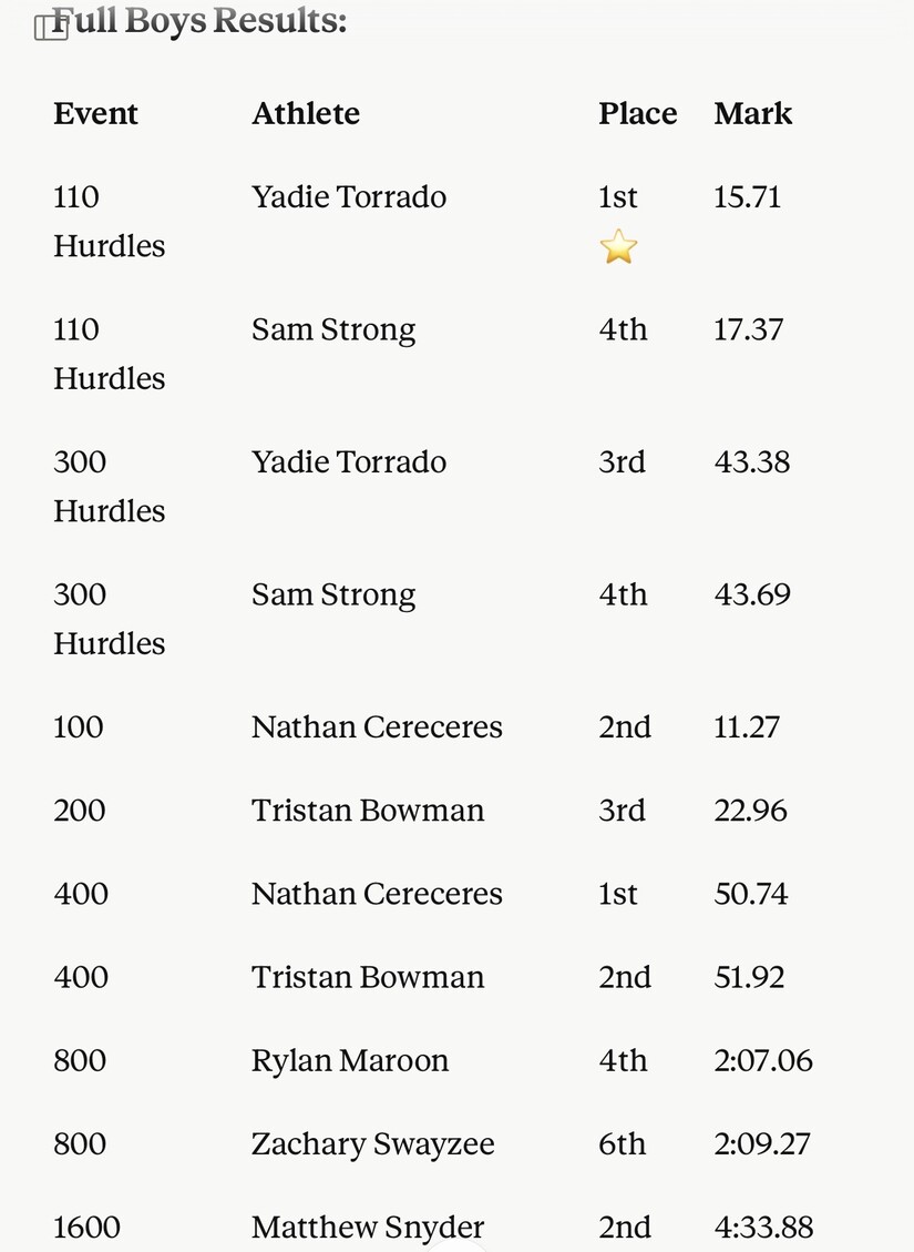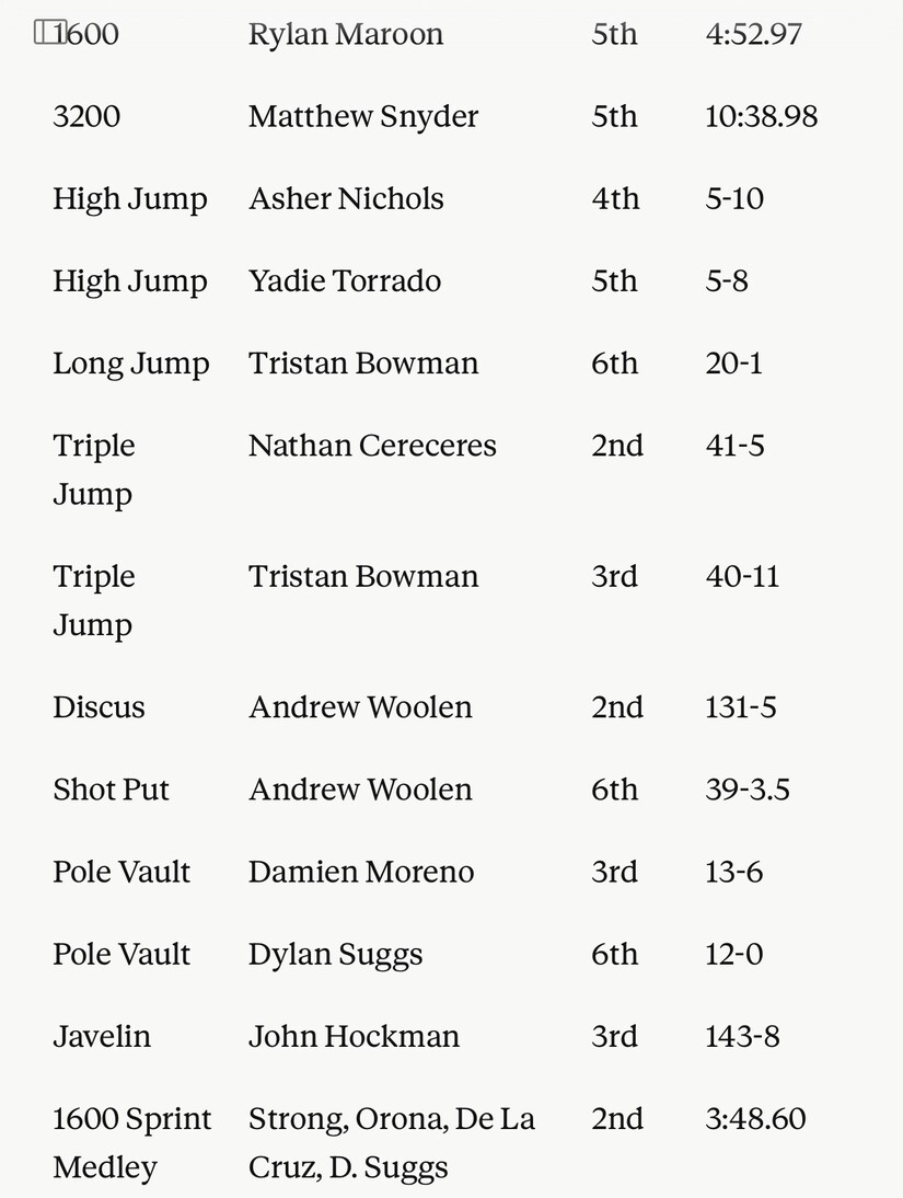 Matthew Snyder continued his strong season with a 2nd-place finish in the 1600 (4:33.88). Andrew Woolen contributed with a 2nd-place throw in the Discus (131-5). On the relay side, the 4x100 team of Bowman, Benitez, Best, and Cereceres finished 2nd in 43.15, and the 1600 Sprint Medley relay placed 2nd in 3:48.60.