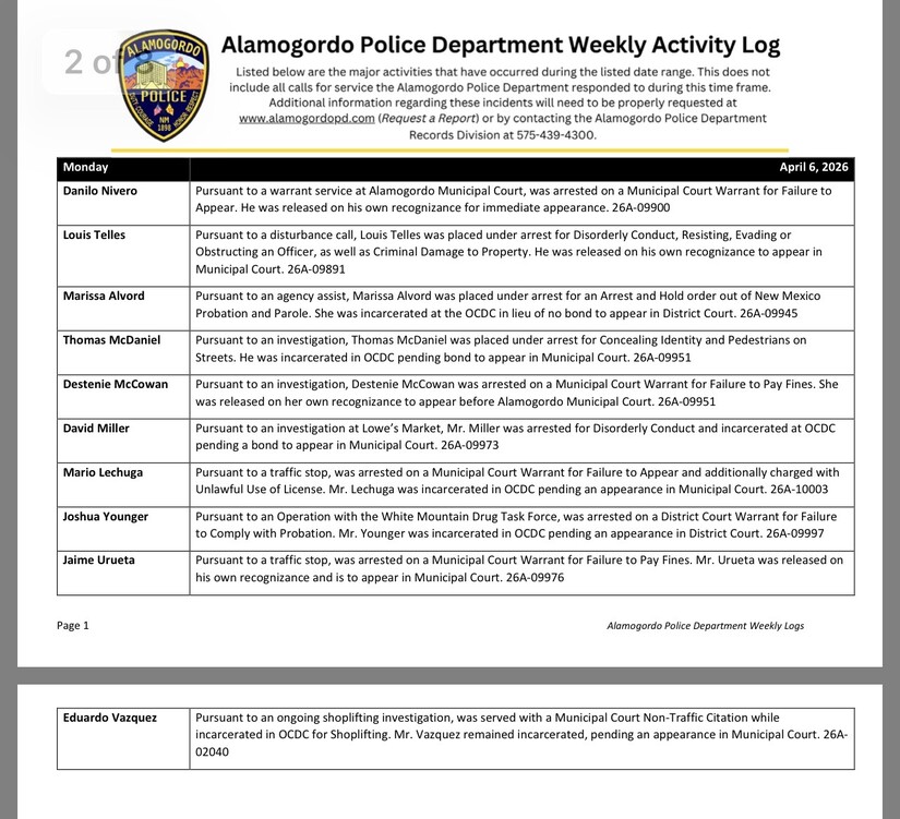 Alamogordo, NM — The Alamogordo Police Department responded to a busy week of incidents from April 6 to April 12, 2026, recording approximately 40 arrests and charges. Warrant-related violations topped the list, while officers also addressed impaired driving, domestic violence, theft, and public disturbances.