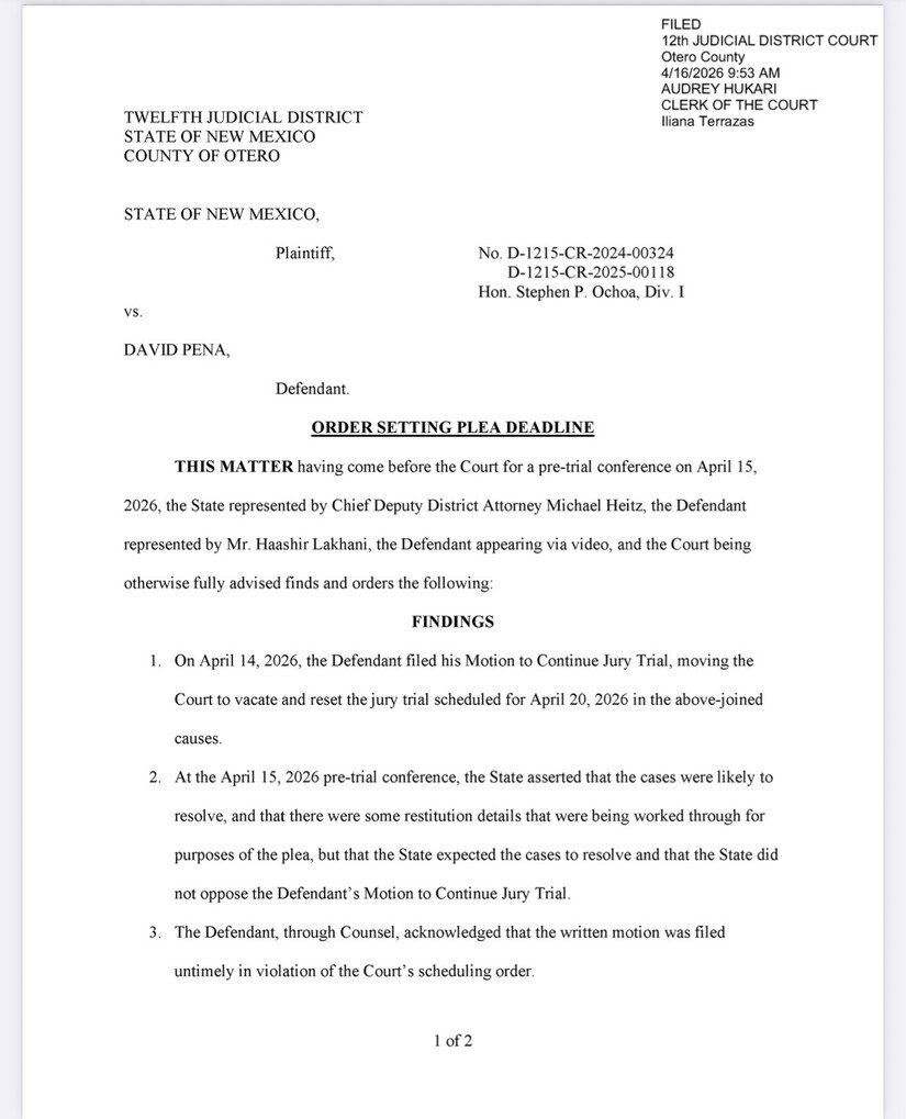 According to the Order Setting Plea Deadline filed April 16, 2026, in the Twelfth Judicial District Court (Case Nos. D-1215-CR-2025-00118 and related case D-1215-CR-2024-00324), Pena filed a motion on April 14 to vacate and reset the jury trial originally set for April 20, 2026. At the April 15 hearing, the State (represented by Chief Deputy District Attorney Michael Heitz) indicated the cases were likely to resolve and noted that restitution details were being worked through for a potential plea. The State did not oppose the continuance.
