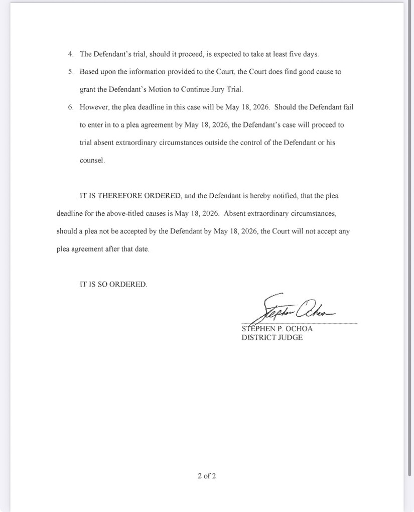 Judge Ochoa found good cause to grant the motion but emphasized that the defendant’s trial, should it proceed, is expected to take at least five days. The order clearly states: Should Pena fail to enter into a plea agreement by May 18, 2026, the case will proceed to trial absent extraordinary circumstances outside the control of the defendant or his counsel. No plea agreements will be accepted after that date.