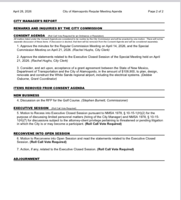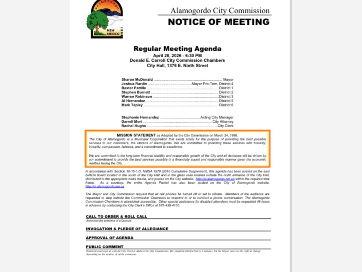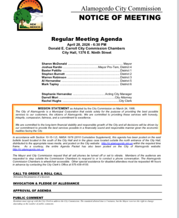 Tonight's Alamogordo City Commission regular meeting is one residents cannot afford to miss — and more importantly, one they cannot afford to stay silent! Its time to get the city manager contract done and quit discussing a settlement and use money for roads verses payouts to protect egos. The agenda is brief, but what it contains is anything but small. From a six-figure grant decision to an executive session on hiring the next City Manager, the choices made in these chambers will ripple across the community for years to come.